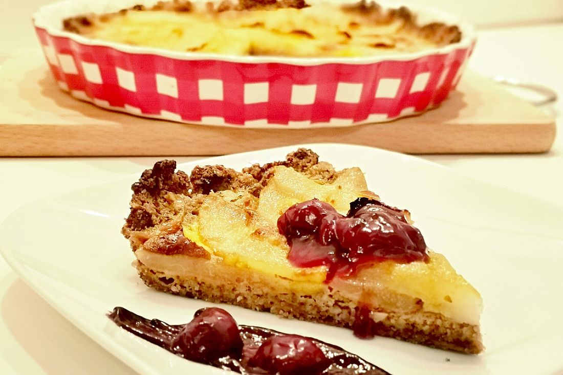 V míse smícháme ořechy, mandlovou mouku, vejce, rum a máslo - tvoříme těsto. Těsto dáme do koláčové formy a rukou rozprostřeme po celé formě včetně okrajů. Důkladně formu vymažeme nebo použijeme pečící papír.