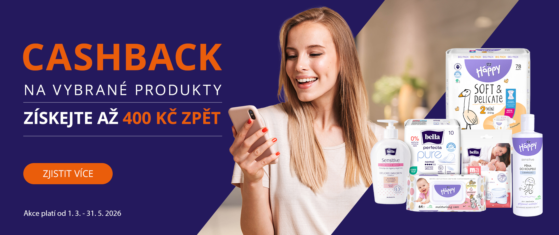 Nakupujte od značky Bella, Bella Happy, Bella Control a Mamma a od 1. 3. 2026 do 31. 5. 2026 a získejte až 400 Kč zpět na Váš účet.