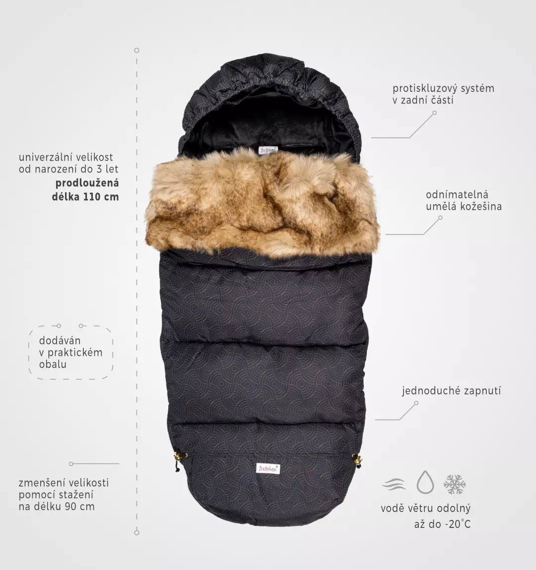 Vaše miminko z něj jen tak nevyroste a zima mu rozhodně nebude. Fusak je navržen i do té největší zimy. Fusak má celou řadu praktických vychytávek. Rozměry: Nastavitelná velikost pomocí šňůrek od 90 cm do 110 cm.