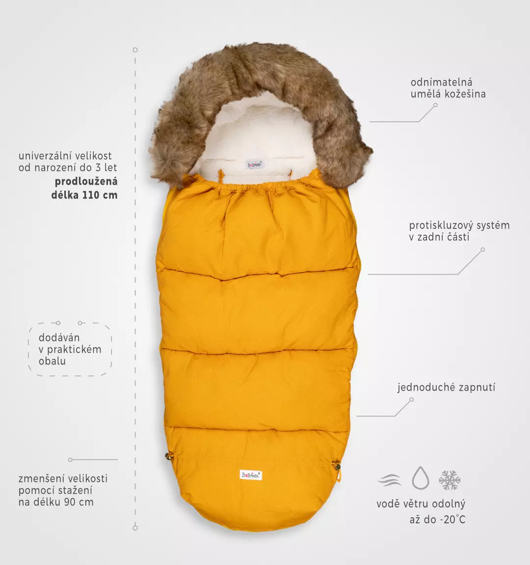 Vaše miminko z něj jen tak nevyroste a zima mu rozhodně nebude. Fusak je navržen i do té největší zimy. Fusak má celou řadu praktických vychytávek. Rozměry: Nastavitelná velikost pomocí šňůrek od 90 cm do 110 cm.