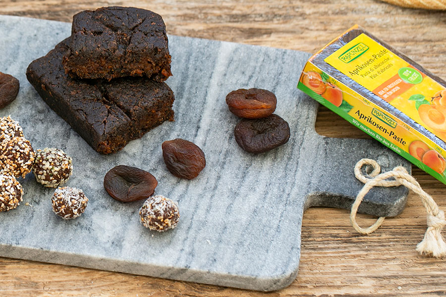 Energetické kuličky s meruňkovou pastou, mandlemi a čokoládovou pomazánkou.