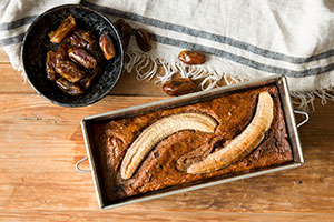 V míse promíchejte mouku s práškem do pečiva, skořicí, vanilkou a špetkou soli. Oloupejte banány, jeden podélně rozkrojte a zbylých pět banánů rozmačkejte v míse. Přidejte olej, datlový sirup a dobře promíchejte. Poté zapracujte všechnu suchou směs a nasekané datle, ořechy a čokoládu. Těsto nalijte do vymazané formy na chlebíček a ozdobte překrojeným banánem. Pečte v troubě předehřáté na 180 °C asi 50 až 60 minut, do středu chlebíčku zapíchněte špejli, pokud bude po vytažení suchá, je chlebíček hotový.