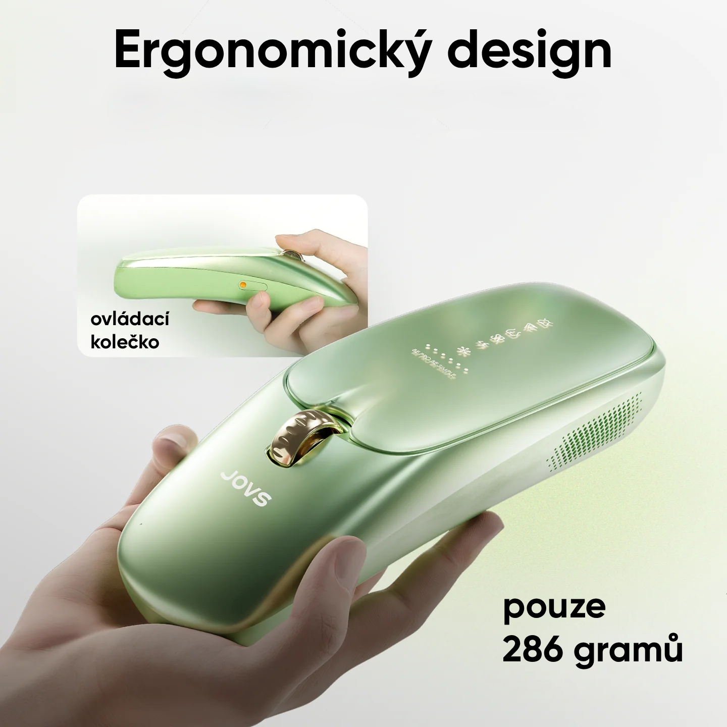 JOVS Scroll v sobě spojuje promyšlený ergonomický design s nejvyšší úrovní bezpečnosti. Jeho tvar ve stylu počítačové myši skvěle padne do ruky, váží pouhých 286 g a umožňuje snadné ošetření i těžko dostupných míst bez únavy. Dvouvrstvá ochrana pokožky – kombinace světelné filtrace a pokročilého chlazení – zajišťuje, že každé použití je naprosto bezpečné i pro citlivou pleť. Navíc nevyžaduje žádnou údržbu ani výměnu lamp, takže zůstává praktickým a spolehlivým řešením pro každodenní domácí péči.
