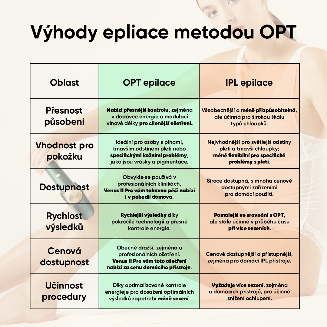 OPT technologie u JOVS Scroll zajišťuje stabilní, rovnoměrné pulzy světla, které pronikají do pokožky přesně a bez kolísání energie – na rozdíl od běžných IPL přístrojů, u nichž výkon často postupně slábne. Díky tomu je ošetření účinnější, bezpečnější a zároveň výrazně komfortnější, protože pokožka není vystavena zbytečnému teplotnímu stresu. OPT tak poskytuje profesionální výsledky s menším rizikem podráždění a s konzistentně vyšší účinností při každém záblesku.