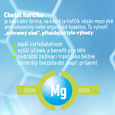 Organický hořčík ve formě chelátů s vysokou vstřebatelností, optimální kombinace více organických forem s různou využitelností.
