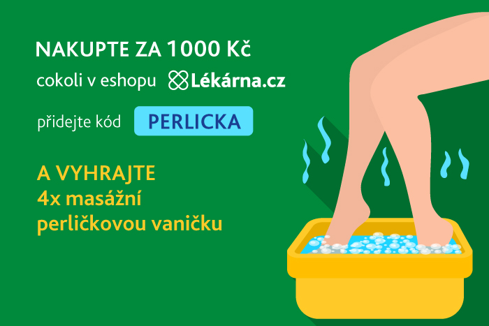 SOUTĚŽ JE UKONČENA. Výherci se stávají: Jaroslava M. z Prahy 8, Jana P. z Kosovy Hory, Veronika S. z Třebosic a Miroslav Š. z Týnce nad Sázavou. Gratulujeme! Pokud si v období od 11. prosince do 16. prosince 2018 koupíte jakýkoli produkt na Lékárně.cz v hodnotě 1000 Kč a výše v jedné objednávce a připojíte kód PERLICKA, budete automaticky zařazeni do slosování o výhru 4 perličkových vaniček pro masáž nohou.