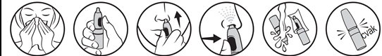 1. Vyprázdněte nos 2. Palec na tlačítko 3. Vložte do nosu 4. Stiskněte tlačítko 5. Očistěte a osušte 6. Nasaďte uzávěr