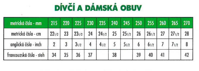 Tabulka dívčí a dámské velikosti