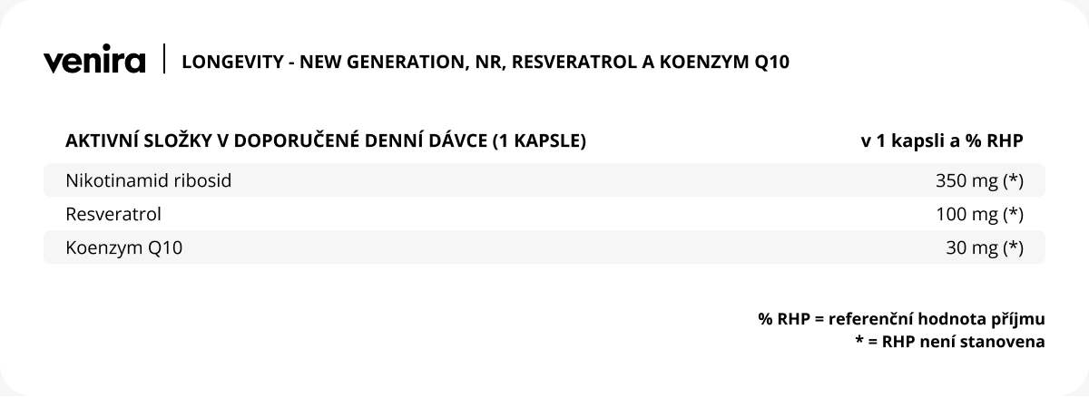 VENIRA longevity new generation obsahuje synergickú kombináciu tří pečlivě vybraných složek: nikotinamidu ribosidu (moderní forma vitaminu B3), resveratrolu z křídlatky japonské a koenzymu Q10. Nikotinamid ribosid je prekurzorem koenzymu NAD+, který je přirozeně přítomen v organismu. Resveratrol je přírodní polyfenol, který se přirozeně vyskytuje v některých rostlinách, zejména v křídlatce japonské, ale také ve slupkách červených hroznů nebo borůvkách. Koenzym Q10 je látka, která je tělu vlastní a přirozeně se v organismu vytváří, nachází se téměř ve všech buňkách, především v mitochondriích.