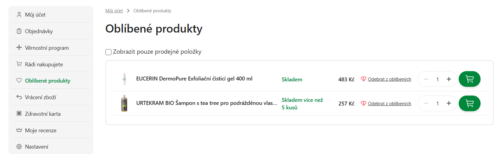 označit srdíčkem a pak je najdete v přehledném seznamu právě v osobním úču a můžete si je znovu objednat :-) To, co se vám líbilo dřív, už se vám nelíbí? Nevadí! Jednoduše si položku odeberete ze seznamu oblíbených produktů.