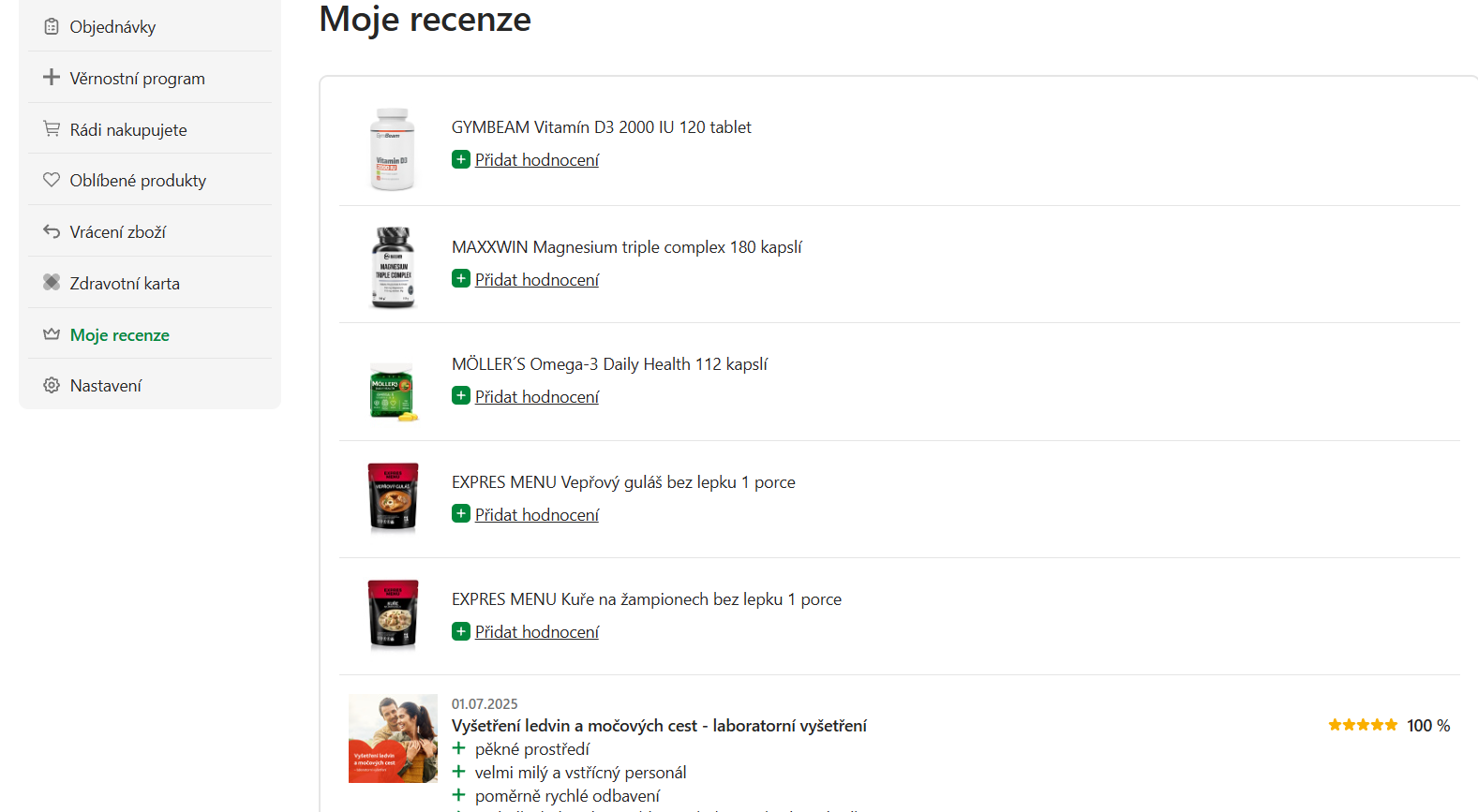 Stále váháte, zda si u nás založit osobní účet? Bez něj u nás můžete nakupovat také, ale s ním budete mít rozhodně větší přehled - a to nejen o objednávkách, ale i o věrnostním programu Lékárna.cz PLUS, svých oblíbených produktech nebo záznamech ve své Zdravotní kartě, kam se vám ukládají výsledky zdravotních služeb, pokud některou z nich objednáte (např. laboratorní vyšetření, lékový audit, intepretace laboratorních výsledků aj.)